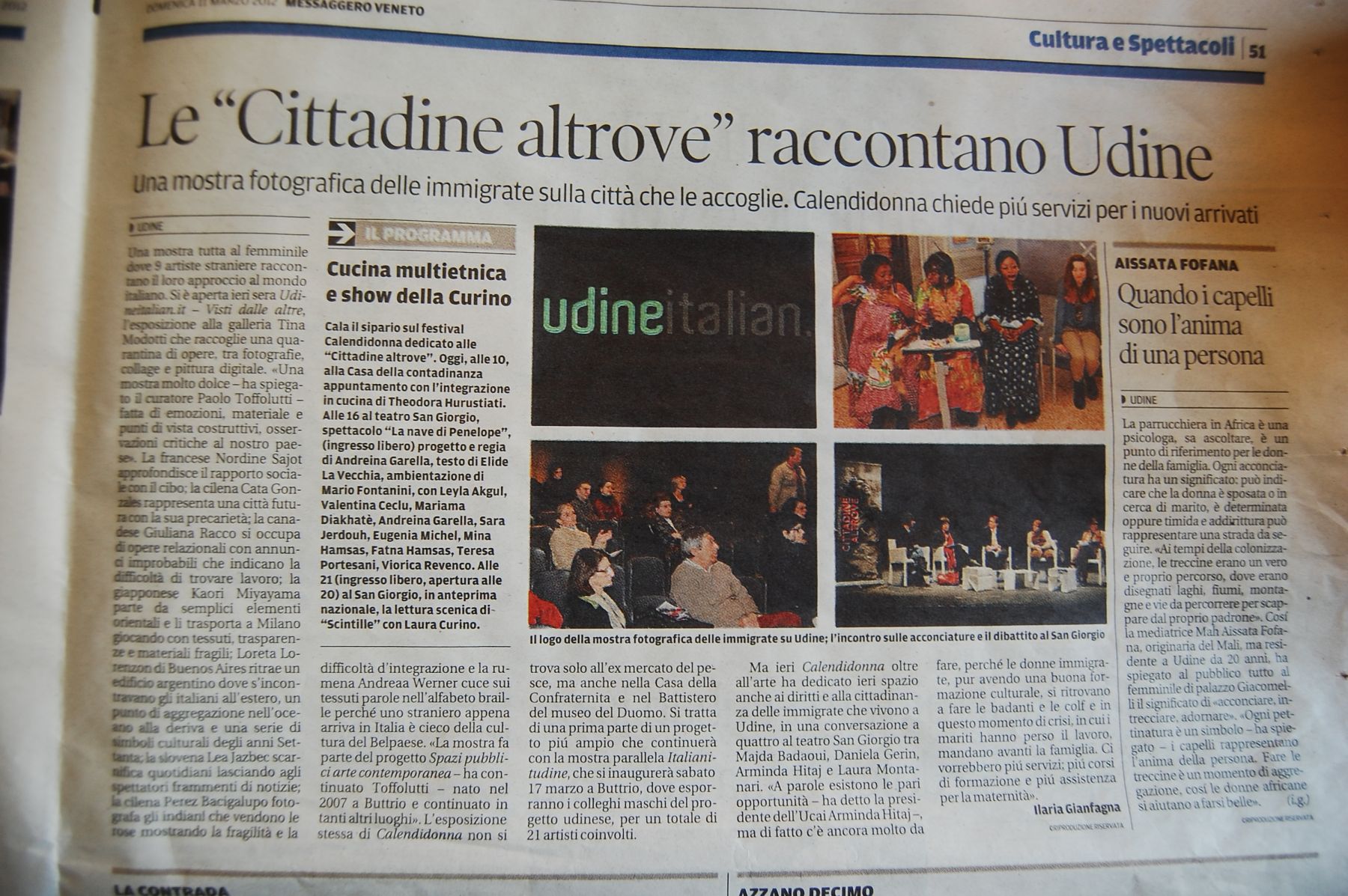 Mostra dedicata ad una riflessione richiesta dal curatore Paolo Toffolutti ad un gruppo di 21 artisti nati all'estero, ma che hanno temporaneamente vissuto in Italia, su quanto nel paese reale, vengano applicati gli articoli della Costituzione della Repubblica Italiana. Le mostre porteranno nei due contesti espositivi, opere che tematizzano i contenuti dei diritti sanciti dalla Costituzione quali: alla persona, alla laicità, alla democrazia, all'uguaglianza, alla solidarietà, alla pace, al lavoro… e lo faranno attraverso opere pittoriche, fotografiche, video, installative, scultoree, performative secondo una selezione di artisti appartenenti alle generazioni comprese dai 25 ai 48 anni di età. Gli artisti invitati sono: Karin Andersen ( Germania), Daniella Alejandra Perez Bacigalupo ( Cile), Tomislav Brajnović ( Croazia), Léo Yigit Ekiz (Turchia), Marc Giloux ( Francia), Lek M. Gjeloshi ( Albania), Cata Gonzales (Cile), Matias Guerra (Cile), Dritan Hyska ( Albania), Lea Jazbec (Slovenia), Kensuke Koike (Giappone), Loreta Lorenzon ( Argentina), Armando Lulaj ( Albania), Kaori Miyayama (Giappone), Robert Pettena (Gran Bretagna), Giuliana Racco ( Canada), Christian Rainer (Germania), Gaston Feltrin Ramirez (Messico), Nordine Sajot (Francia), Andreea Werner ( Romania), Eltjon Valle Marinz ( Albania). Udineitalian.it oltre alla galleria Tina Modotti sarà ospitata in altre due sedi che sono la Casa della Confraternita, in salita Castello, ed il Battistero del Duomo di Udine piazza del Duomo, inoltre la mostra udineitalian.it è inserita nella programmazione di Calendidonna 2012. Oltre ai contributi apportati con le opere dagli artisti, presenti in mostra per le inaugurazioni, vi saranno contributi critici e culturali apportati così come in catalogo da: Marco Baravalle, Riccardo Caldura, Annalisa Comuzzi, Rachele D'Osualdo, Alisa Franzil, Kristrian Franzil, Veronica Fratter, Alice Ginaldi, Paolo Toffolutti. La produzione e realizzazione del progetto è stata fatta da neo associazione culturale udine ed è resa possibile dai contributi di Regione Autonoma Friuli Venezia Giulia Assessorato all'Istruzione Formazione e Cultura, Comune di Buttrio Assessorato alla Cultura, Calendidonna, e con la collaborazione di Comune di Udine Assessorato alla Cultura, Civici Musei, Museo del Duomo, Proloco Buri, Generali Assicurazioni, Interna, Lis Neris.