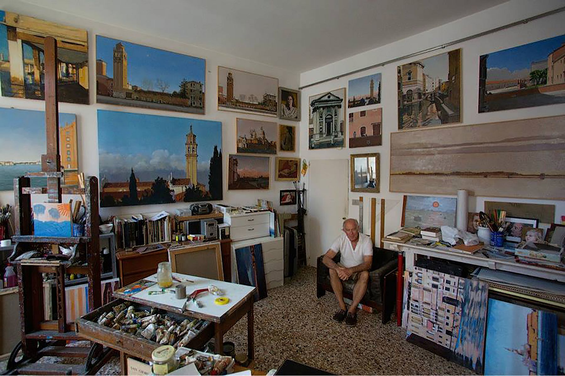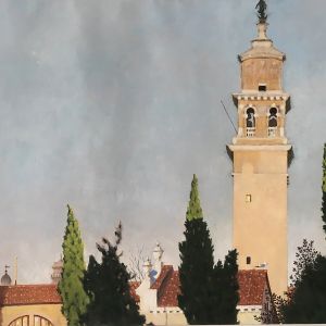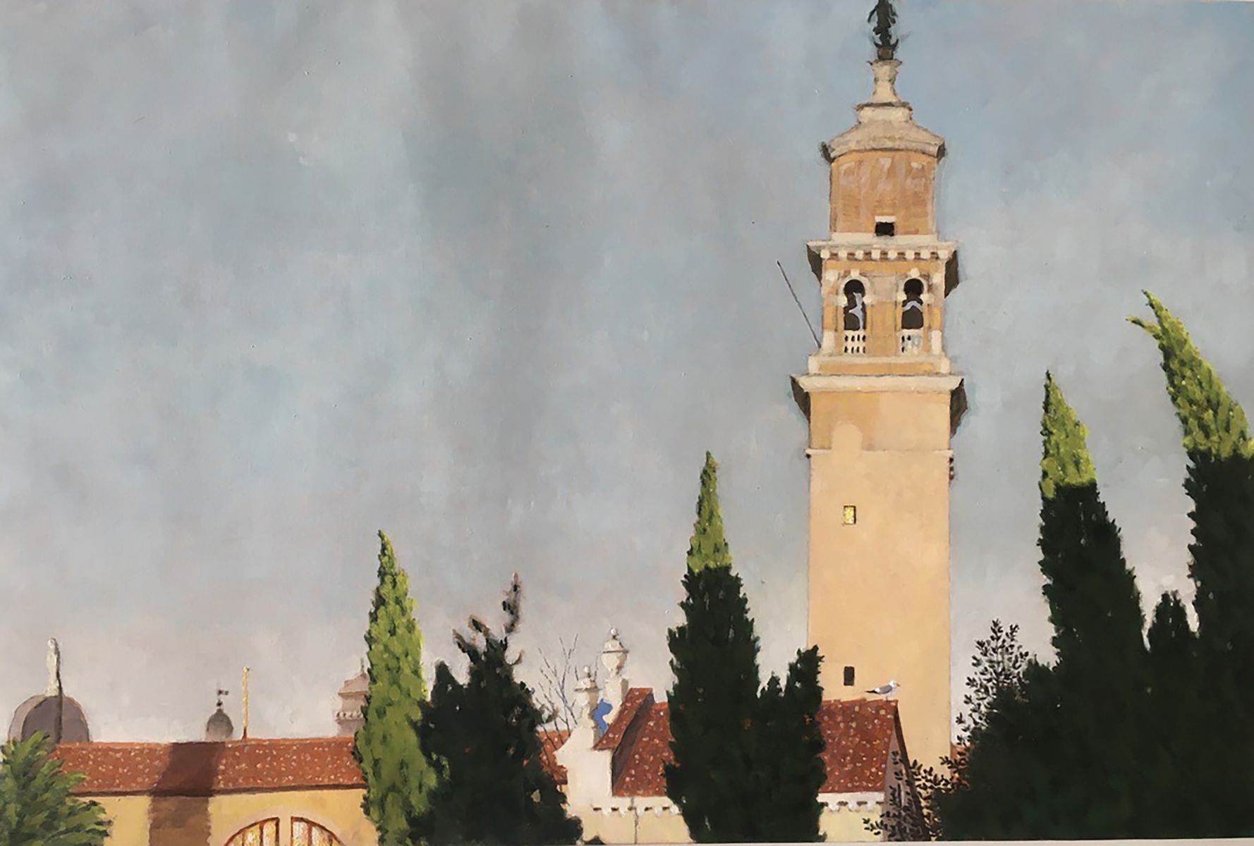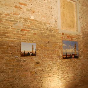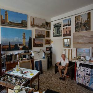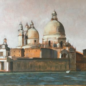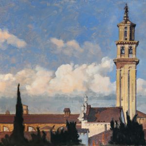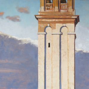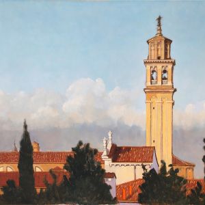 Nello studio di Robert, in mezzo a tanti dipinti, la maggior parte vedute del sestiere di Dorsoduro e vicinanze, il mio sguardo curioso insiste nel fissare le medesime prospettive. Paesaggi ripetuti da inquadrature e formati ogni volta differenti, mi raccontano una Venezia difficilmente riconoscibile. Un campanile dall'aria familiare, che non riesco a collocare nel mio immaginario, mi parla lontano e solitario.