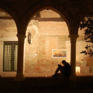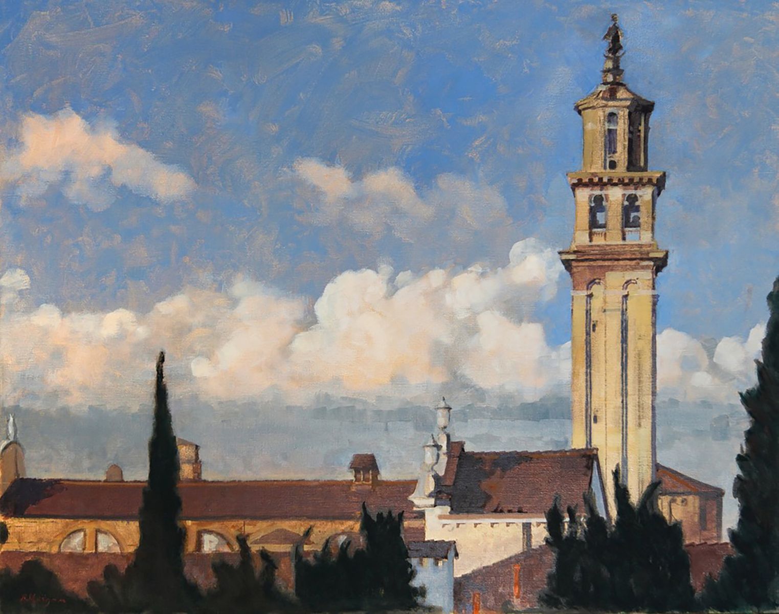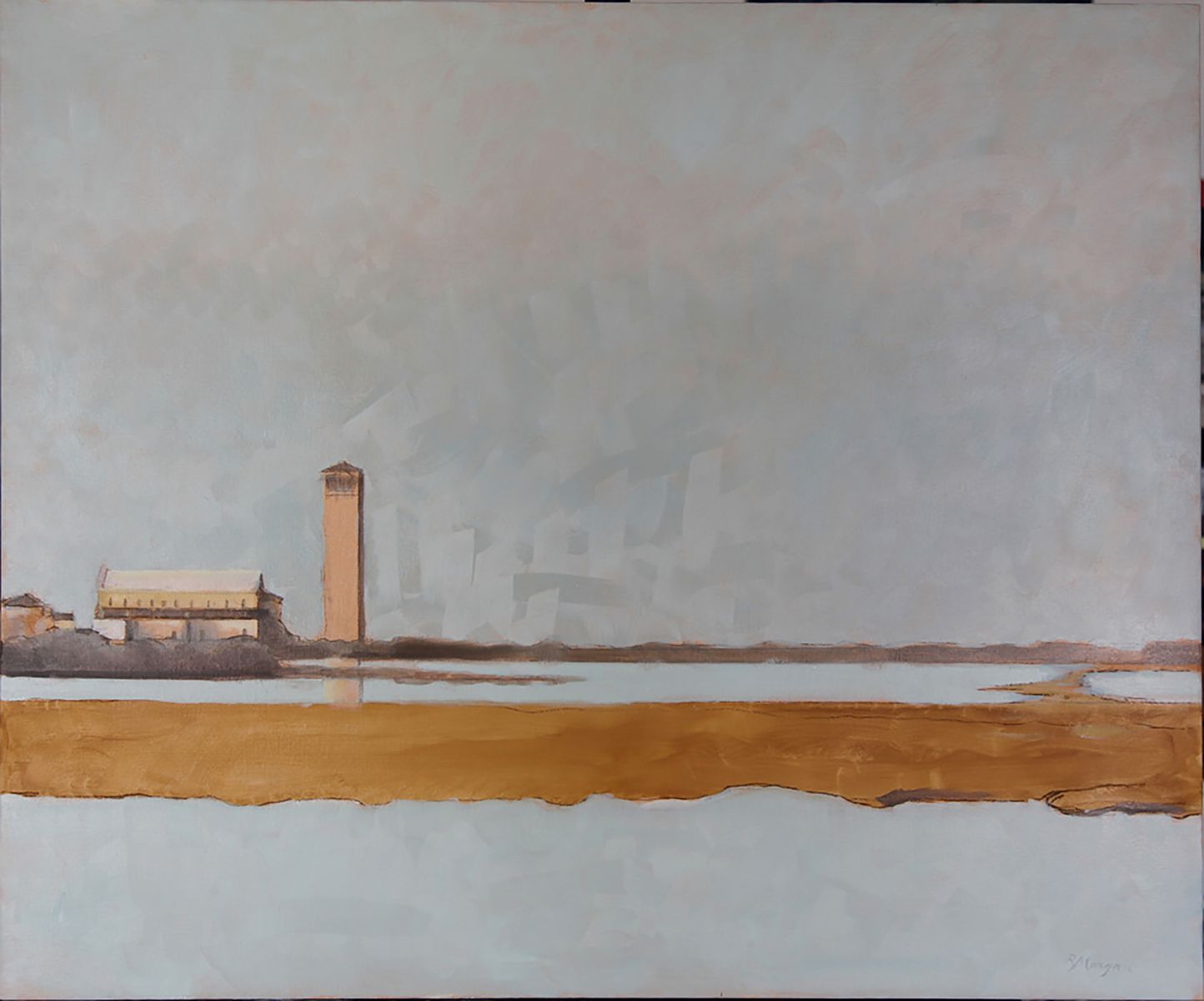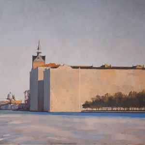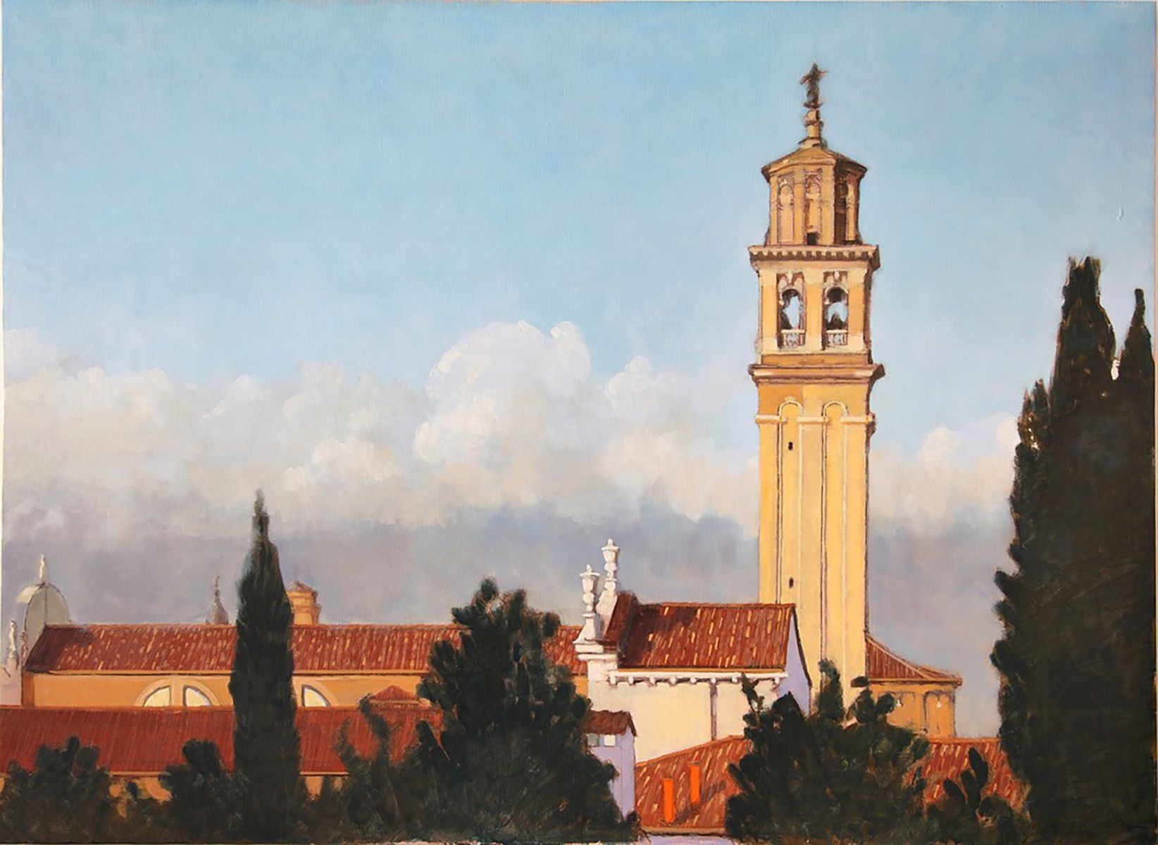 Nello studio di Robert, in mezzo a tanti dipinti, la maggior parte vedute del sestiere di Dorsoduro e vicinanze, il mio sguardo curioso insiste nel fissare le medesime prospettive. Paesaggi ripetuti da inquadrature e formati ogni volta differenti, mi raccontano una Venezia difficilmente riconoscibile. Un campanile dall'aria familiare, che non riesco a collocare nel mio immaginario, mi parla lontano e solitario.