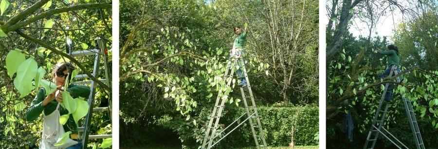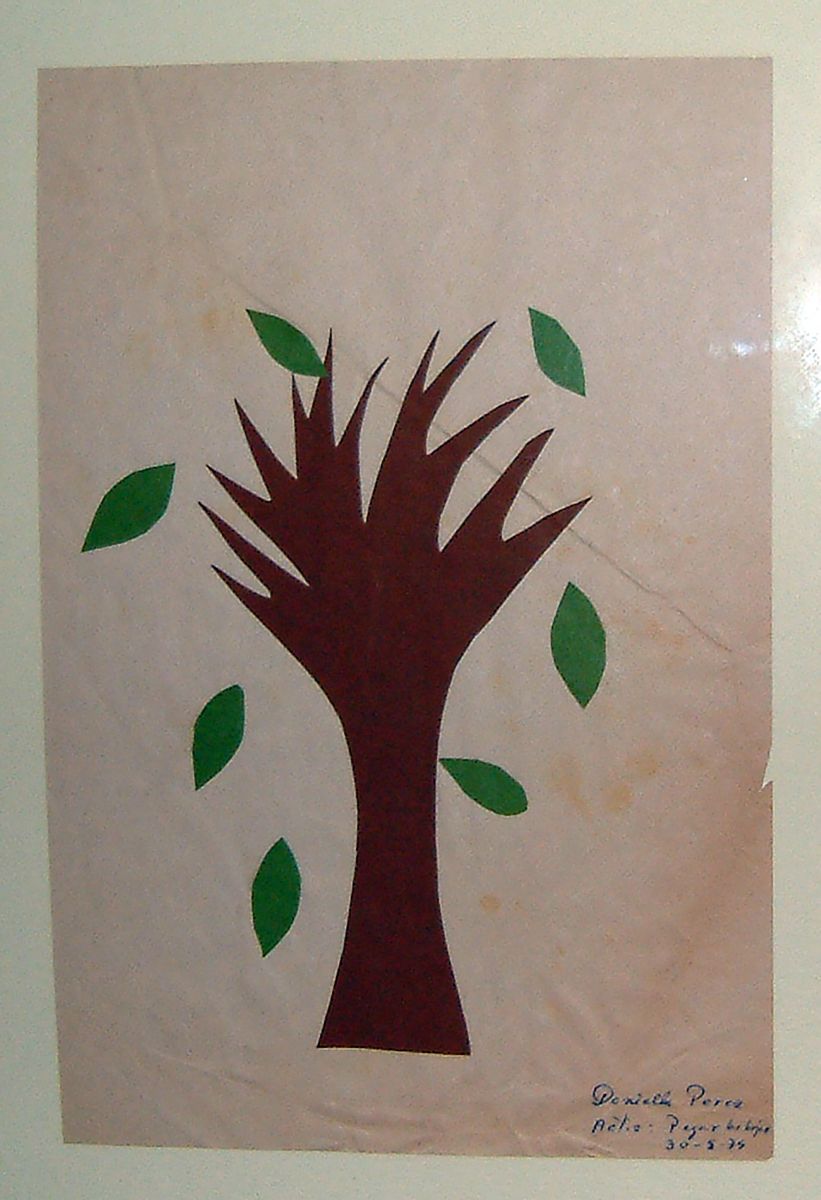 Il progetto rielabora un collage realizzato nel Jardín Infantil in Cile nel 1979, quando il compito era semplice e guidato: incollare sette foglie verdi su un tronco prestampato. L’artista riprende oggi quel gesto infantile, trasformandolo in un’azione libera e consapevole. Come un giardiniere che cura le piante, interviene sull’albero reale per collegare passato e presente, memoria e pratica artistica adulta.