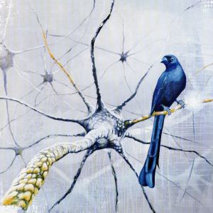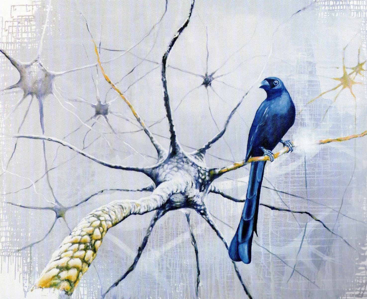 In “Neuronenvogel” l’uccello blu, attento, esplora un nuovo universo. Come se tornasse dalla migrazione... portando con se nuove notizie.