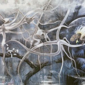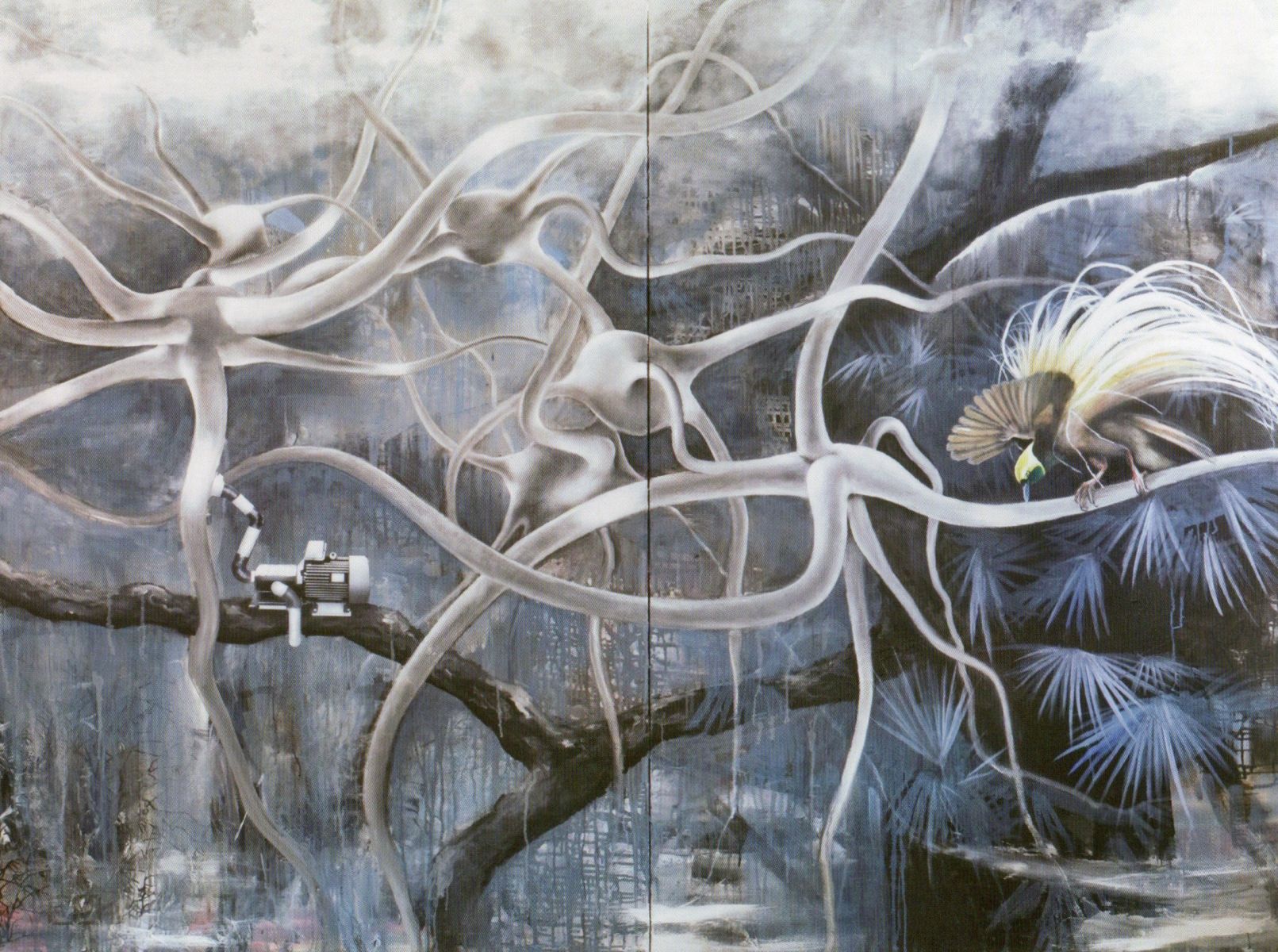 I luoghi si popolano, come in “Paradisvogel”. Il motore appoggiato sul ramo collegato al tessuto organico, eterico come l’aria, raccoglie o carica l’energia necessaria per trasformare e nutrire una intera struttura? L’uccello con le piume aperte, danza vigoroso nell’attesa che il motore si carichi, oppure è il motore a caricare, a nutrire l’habitat?