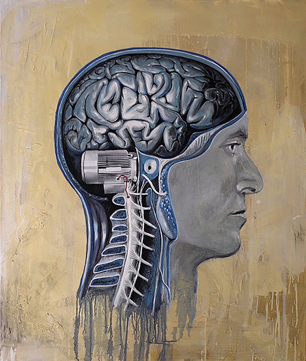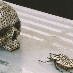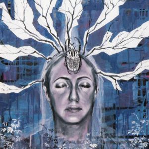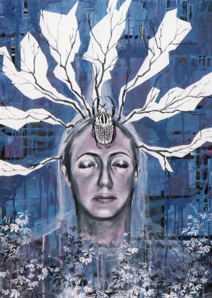 Come un cuore sano (un motore funzionante), pompa l’energia necessaria a sviluppare la crescita e può, come nel caso di Herzgefaesse, estendere, ramificare verso l’alto le sue vene... in natura... gli alberi, se hanno nutrimento, si sviluppano, creano radici... e più hanno radici, più alti riescono a crescere. Simile casualità fa prendere all’albero la sembianza di una donna in meditazione che nell’universo blu (colore per antonomasia rilassante, associato allo spazio interiore, al pensiero, all’armonia) permette a uno scarabeo – Golia l’insetto più grande del mondo - di posarsi sulla fronte, ed entrare in profonda connessione, tanto che le sue zampe si confondono con i rami, rami che fuoriescono dalla testa.